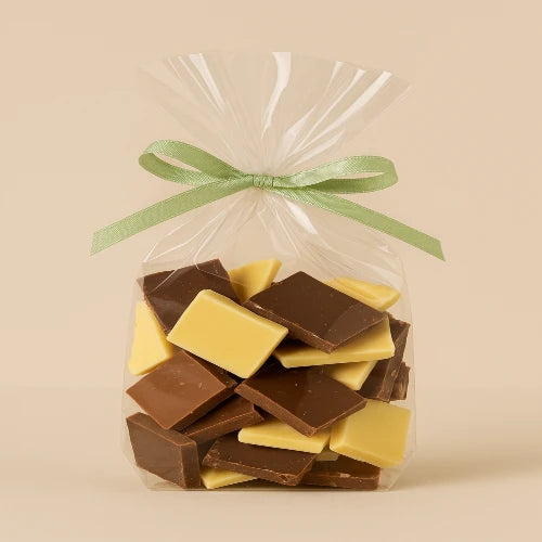 שקית של 100 גרם עם אוסף שברי שוקולד איכותי – חלב, מריר, לבן ובלונדי.