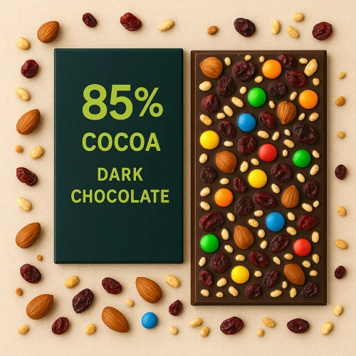 טבלת שוקולד מריר משובחת במשקל 150 גרם עם 85% מוצקי קקאו, אליה מצורפות תוספות מפתיעות שנבחרות במיוחד עבורכם. ניתן לבחור כמה תוספות תרצו בטבלה – ואנחנו נדאג להרכיב עבורכם שילוב עשיר וטעים ממבחר אפשרויות: אגוזים, סוכריות צבעוניות, חמוציות, פצפוצי אורז, עדשים ועוד.