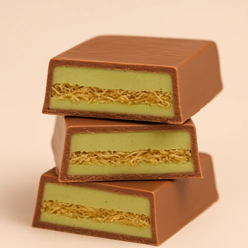 מחית פיסטוק עשירה, שערות קדאיף פריכות ושכבת פיסטוק נוספת – הכל עטוף בשוקולד חלב, מריר או לבן לבחירה.